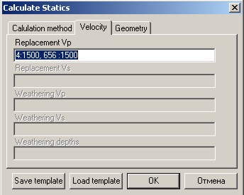 Вкладка Velocity (рис. 4.19.плакат 17б) – задание значений скоростей (а также мощность зоны малых скоростей, если она используется), которые будут использоваться при расчете статических поправок. То, какие из полей на этой вкладке доступны, зависит от выбранных настроек на вкладке Calculation method. Необходимо задать значения всем доступным полям. Значения могут меняться по латерали (между пикетами – линейно интерполируются). Синтаксис задания всех значений на этой вкладке такой: номер_пикета: значение, номер_пикета - номер_пикета: значение.