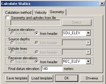 - Опция Use file позволяет задать статические поправки, записанные в файл (выбирается в диалоговом окне, появляющемся при нажатии кнопки File…, или имя файла задаётся вручную в текстовом поле).