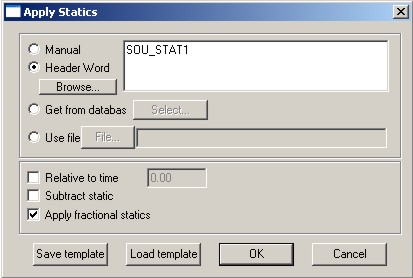 - Опция Header Word позволяет задать статические поправки, ранее занесенные в поля заголовков трасс (имя поля выбирается в окне, открывающемся при нажатии кнопки Browse).