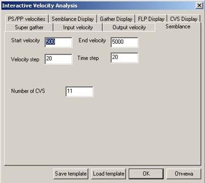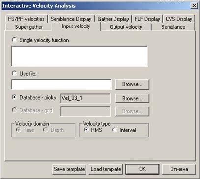 Формирование одномерной скоростной модели (зависимости V(t0)), как правило, производится путём пикировки максимумов сембланса в поле Velocity. Положение курсора в этом поле отображается в поле Offset расчётным годографом отраженной волны. График зависимости V(t0) отображается также и в поле CVS. Редактирование графика производится путём перемещения, добавления и удаления точек, что отражается в поле суммотрасс. Всё это позволяет обоснованно выбрать
