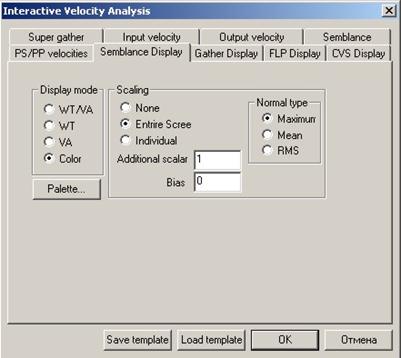 - Вкладка Semblance Display (окно спектра скоростей) представлена на рис.4.31(плакат 23д) используется для задания параметров отображения спектра скоростей, рассчитанного по коэффициентам подобия (КП) и имеет следующий вид: