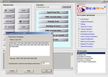 Модуль Velocity Scan выполняет многократное суммирование по ОГТ участка профиля. Участок описывается в библиотеке LSE, используемой модулем Trace Input (начальныё модуль задания). При суммировании используются кинематические поправки, рассчитанные при VОГТ = const (t0). Значения скоростей (скорости сканирования) задаются в поле Набор скоростей (рис. 4.35.плакат 26).
