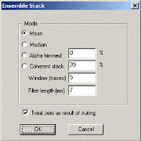 Модуль Ensemble stack (Суммирование трасс) производит суммирование всех трасс каждой из заданных входных композиций в одну трассу. Каждый отсчет трассы на выходе будет являться комбинацией соответствующих отсчетов трасс на входе.