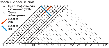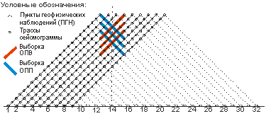 Для выделения регулярных волн и исключения случайных помех обработке подвергаются две взаимные базы анализа, формируемые на базе встречных сейсмограмм ОПВ и ОПП. Принципы формирования взаимных баз анализа (Рис. 5.1.):