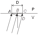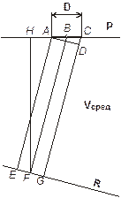 Как было сказано выше, вектор параметров, определяемый на базе D относится к средней точке базы (В). Нетрудно видеть, что угол между сейсмическим лучем в точке В и вертикалью равен углу между фронтом волны (AD) и горизонтальной плоскостью приведения Р (угол CAD). Синус этого угла равен отношению CD / АС = CD / D. Значение CD можно определить как приращение времени регистрации волны на базе D (ti) умноженное на значение скорости распространения волны в толще, прилегающей к плоскости V (этот параметр известен с достаточной детальностью из материалов изучения ВЧР). Угол CAD легко пересчитывается в значение углового коэффициента начального луча, а его уравнение может быть записано как уравнение прямой проходящей через заданную точку (В) с вычисленным угловым коэффициентом.
