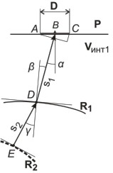 При построении второй границы (R2 на рис. 5.5) в каждой из точек регистрации (на рис.5.5. – точка В) по значениям параметра ti и Vинт 1 определяется уравнение начального луча, как это описановыше. Решая совместно это уравнение и уравнение первой отражающей границы R1, находят координаты точки преломления луча (D) и путь пробега волны по рассматриваемому лучу в первом слое (обозначим его как s1, а путь пробега во втором слое, соответственно, – как s2).