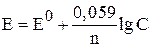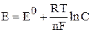 , где E – электродный потенциал, В; E0 – стандартный электродный потенциал, В; R– газовая постоянная; T – абсолютная температура полуэлемента, К; F – число Фарадея; C – молярная концентрация ионов электролита, определяющих потенциал электрода, моль/л; n – число электронов, отданных или принятых в соответствующей электродной реакции.