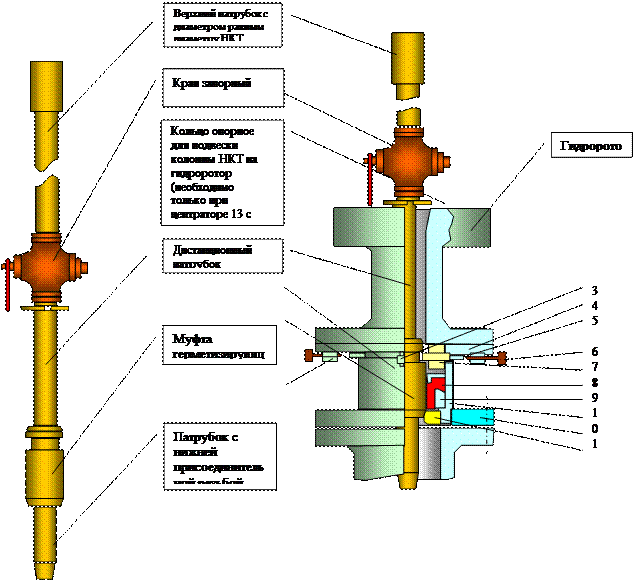 При необходимости герметизации устья скважины в случае появления признаков нефтегазопроявления, а также при длительных перерывах в работе, запорную компоновку необходимо присоединить к колонне труб НКТ. Натяжением колонны труб клиновой захват гидроротора освобождается и снимается, с помощью извлекателя из гидроротора вынимается центрирующая втулка. Спуском герметизирующей муфты до посадки на центратор (d 120 мм) она будет сопряжена с резиновым уплотнителем 8, с обеспечением автоматической герметизации затрубного пространства. Поворотом рукоятки крана перекрывается канал колонны труб.