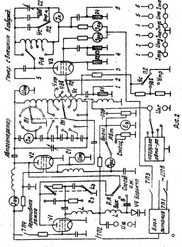 Работа автогенератора контролируется шестью приборами, которые измеряют переменные напряжения на аноде -