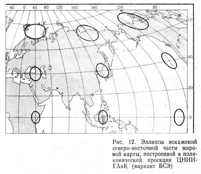 они ориентированы по главным направлениям. Радиус вектор эллипса искажений может быть ориентирован по любому направлению и определяет частный масштаб длин по этому направлению. Форма эллипса характеризует искажения углов и форм – они искажены тем больше, чем больше эллипс отличается от окружности. Площадь эллипса пропорциональна искажению площадей и тем она больше, чем больше искажены площади. Желая показать на карте эллипсы искажений, условно принимают радиусы бесконечно малых окружностей на шаре или эллипсоиде равными конечной величине (например, 5 мм в масштабе карты). Тогда все показываемые на карте эллипсы также примут конечные величины.