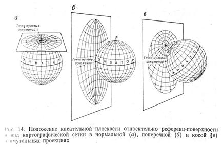 3. По ориентировке вспомогательной поверхности относительно полярной оси или экватора эллипсоида или шара различают проекции (рисунок 14-17):