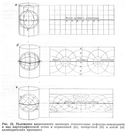 б) цилиндрические в которых поверхность эллипсоида или шара переносится на боковую поверхность касательного к ней или секущего её цилиндра, после чего последний разрезается по образующей и развертывается в плоскость;