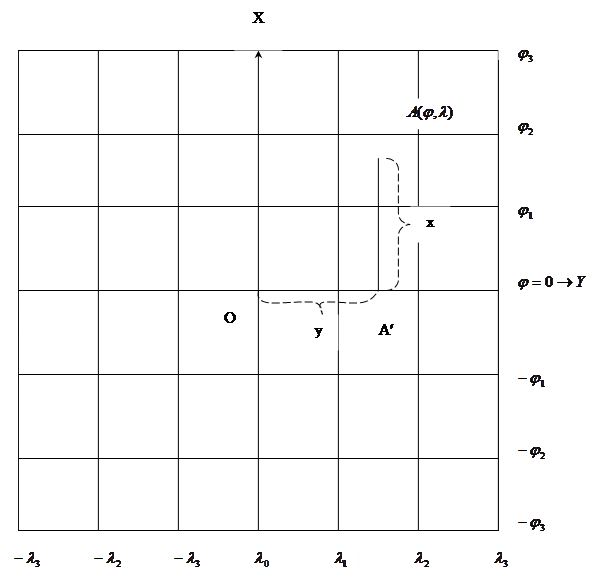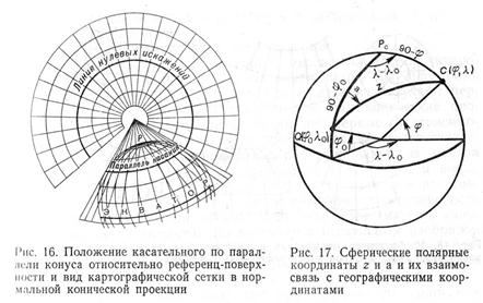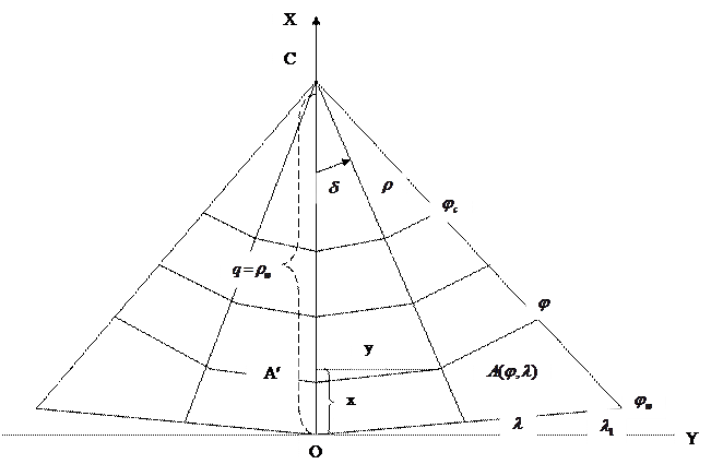 Рис. 2.6. Системы координат в нормальной конической проекции