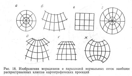 4. По виду нормальной картографической сетки, прежде всего, выделяют проекции, в которых параллели изображаются на плоскости линиями постоянной кривизны, то есть прямыми линиями, окружностями или их дугами. Наиболее распространенные картографические проекции показаны на рисунке 18: