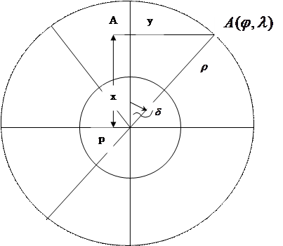 полярный радиус и прямоугольные, начало которых находится в точке пересечения среднего меридиана с южной (в северном полушарии) параллелью изображаемой территории