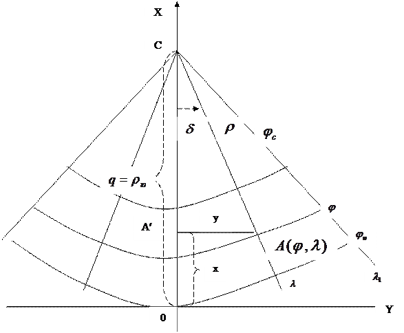 Рис. 2.11. Системы координат в нормальной конической проекции