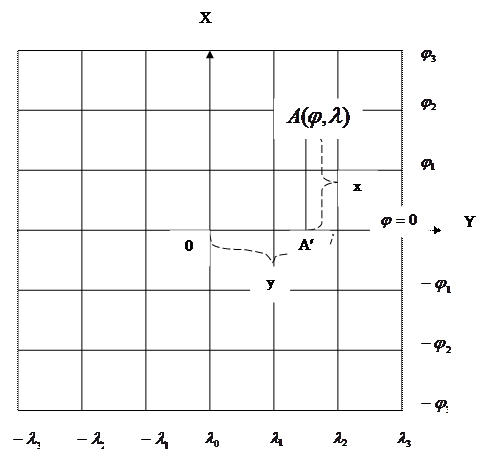 Рис. 2.12. Система прямоугольных координат в нормальной цилиндрической проекции