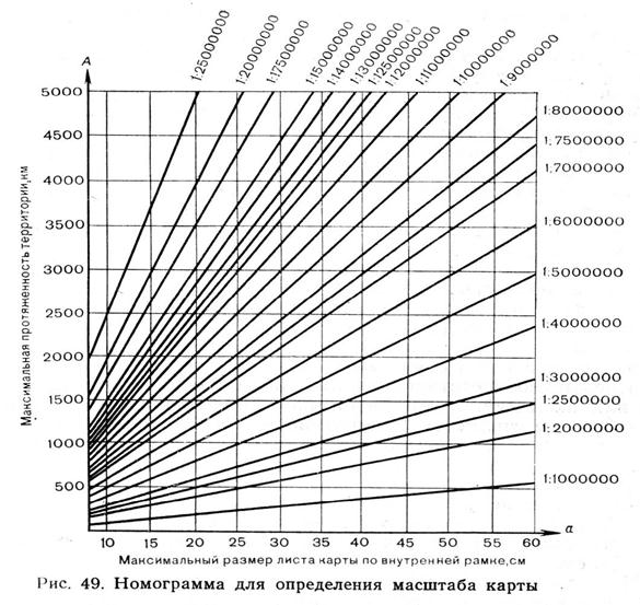 2. Когда требования к точности карты не играют определяющей роли, масштаб выбирают исходя, прежде всего из назначения территориального охвата и заданного формата карты. Во втором случае используют номограмму для определения масштаба. Для серии карт и карт атласов целесообразно выбирать ограниченное число масштабов, преимущественно округленных, с коэффициентом перехода от одного масштаба к другому (1:2; 1:2,5; 1:3; 1:5).