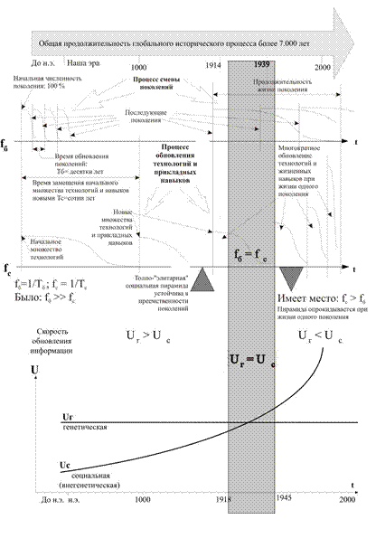 Выявленные частоты fб и fс — это меры скорости обновления информационного состояния общества (как иерархически организованной системы) на биологическом и социальном уровнях в её организации соответственно. На нижнем графике (вдоль третьей хронологической оси рис. 8) Uг (приблизительно неизменная на протяжении всей истории) характеризует скорость обновления генетической информации (мнемонический индекс «г») в популяции; возрастающая на протяжении всей истории Uс характеризует скорость обновления культуры как свойственной обществу информации внегенетической, т.е. не передаваемой от поколения к поколению в готовом к употреблению виде на основе генетического механизма биологического вида «Человек разумный» (мнемонический индекс «с» означает «социальная»).