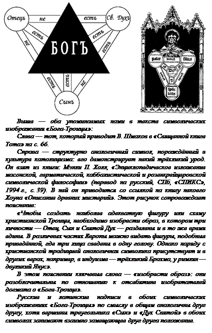 Вопреки этому в народе без лишних мудрствований и посвящений говорят: «Бог троицу любит». Кто хочет, может понимать эту поговорку в смысле любви «Бога-Троицы» к троекратным повторениям событий; но мы понимаем её прямо: в смысле выраженного русским языком основного знания народа о любви Бога к Мирозданию, существующему как триединство: «мера (предопределение) — материя — информация». И такому пониманию отношения Бога и Троицы соответствует рисунок некоего символа, приводимый В.Шмаковым в «Священной книге Тота» (с. 66), изображённый, по его словам, на одной из стен в трапезной Троице-Сергиевой лавры (сохранился ли он после 1917 г. — мы не знаем). Аналогичный символ есть и в культуре католицизма. Оба символических изображения «Бога-Троицы» представлены на иллюстрации на следующей странице.