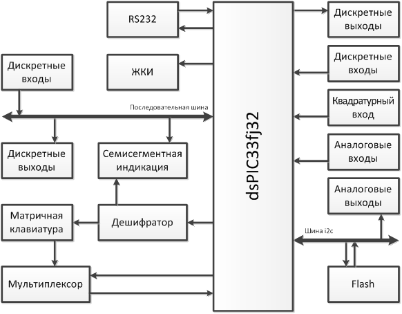 Стенд построен на базе микроконтроллера dsPIC33fj32mc204. Микроконтроллер имеет встроенное ОЗУ для хранения пользовательских программ. Для изучения простейших операций ввода-вывода дискретных данных и ввода аналоговых данных непосредственно к микроконтроллеру подключены светодиодные индикаторы, тумблеры и аналоговые задатчики. Для изучения принципа обработки квадратурного сигнала используется энкодер. Для подключения большого числа периферийных модулей в стенде организована последовательная шина данных, по которой происходит управление портами расширений дискретных входов-выходов, а так же светодиодной семисегментной индикацией. Так же для взаимодействия с пользователем посредством знако-символьной информации к микроконтроллеру подключен жидко-кристаллический индикатор (ЖКИ). С помощью дешифратора и мультиплексора реализована возможность обработки клавиатуры, построенной по матричной схеме. Для подключения иных периферийных устройств (ЦАП, внешняя память) используется шина I2C. Для организации связи с внешними устройствами (в частности с ПК) микроконтроллер имеет порт последовательного асинхронного приёмо-передатчика, позволяющий организовывать обмен данными по интерфейсу RS232.