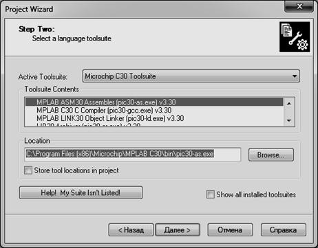 5. 4 В окне выбора языка программирования в качестве инструмента программирования (Active Toolsuite) установите «Microchip C30 Toolsuite», и выберите язык программирования Assembler ASM30 (рисунок 18.4) и нажмите кнопку «Далее».