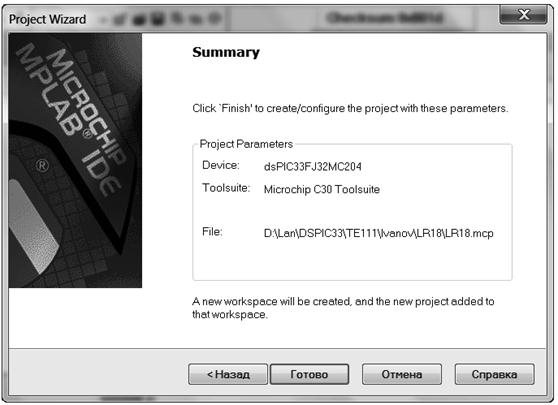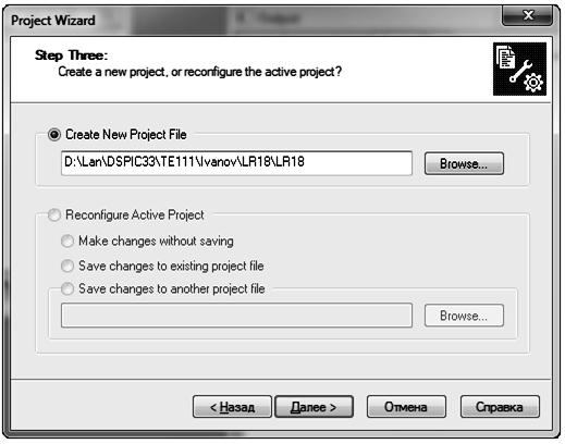 В поле «Имя файла» задайте имя файла: LR18. Нажмите «Сохранить». В открывшемся окне (рисунок 18.5) в поле «Create New Project File» конечный пункт должен выглядеть так: «D:\Lan\DSPIC33\TE111\Ivanov\LR18\LR18». Нажмите кнопку «Далее».