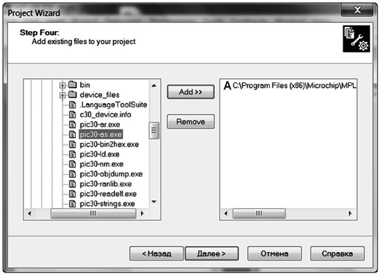 5. 7 В открывшемся окне (рисунок 18.6) добавим существующие файлы в проект: «+C\+Program Files (x86)\+Microchip\+MPLAB ASM30 Suite\+bin». В открытой папке выбрать файл «pic30-as.exe» и добавить его, нажав «Add». Нажать кнопку «Далее».