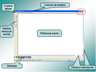 (Строка заголовка, строка меню, панели инструментов и их настройки; Палитра, полосы прокрутки (горизонтальная и вертикальная) рабочая область)