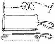 Пилы. В хирургии пилы применяют для пересечения костей, которые различают трех основных видов (Рис.4.): листовая пила Шарьера (Рис.4,в), дуговая пила Шарьера (Рис.4,б) и пила Джильи (Рис.4,а), выполненная в виде «острой» проволоки, скрученной в спираль. Кроме того, в травматологии используют различные виды электропил.