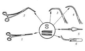 Рис.8. Сосудистые зажимы: 1- прямой, 2-угловой, 3-зажим Сатинского, 4- изогнутый, 5-6 сосудистые клеммы типа «бульдог»