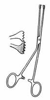 Атравматический кишечный жом - концы рабочих губок имеют вид поперечных полосок, на внутренних поверхностях которых имеются насечки (Рис.14, а). Применяется для удержания кишечной стенки при операциях колостомии и гастростомии., для остановки кровотечения, когда источник не установлен. Может также использоваться для удержания мягких и легкоранимых структур (маточные трубы, мочеточник, аппендикс и др.).