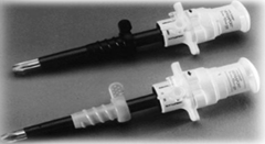 Игла с каплевидным утолщением на конце может быть прямой или изогнутой. Применяется для вскрытия вены при введении катетера.