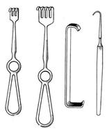 Зубчатый крючок Фолькмана - имеет ручку цельнометаллическую или с отверстием для пальца различной конфигурации, рабочая поверхность представлена многозубчатыми острыми или тупыми крючками.