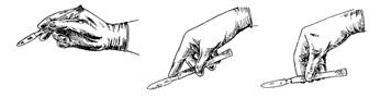 Рис.26. Положение скальпеля в руке хирурга а) по типу писчего пера, б) по типу столового ножа, в) по типу смычка