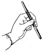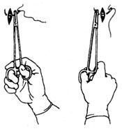 К пинцету также относится «правило трех пальцев», которыми держат его, как писчее перо (Рис.28). Сила сжатия пинцета пальцами должна быть минимально необходимой, но не чрезмерной, так как мягкие ткани легко раздавить, плотные прорезать, а твердые - раскрошить.