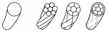 2. Комплексная нить состоит из множества волокон (зачастую хирурги называют комплексную нить полифиламентной, что не рекомендуется современными стандартами). В зависимости от способа соединения этих волокон выделяются три вида комплексных нитей (Рис.31, б, в, г).