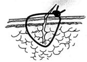 При прошивании ткани делают ротационные движения предплечьем в направлении острия иглы (Рис.30). При этом следует заранее нацелить иглу, определив место как ее вкола, так и выкола. Для обеспечения выкола иглы в намеченной точке допустимо осторожное насаживание ткани на иглу с помощью разомкнутого пинцета, плотно прижатого ребрами браншей по обе стороны от намеченного места выкола иглы. Такой прием целесообразен при прошивании очень плотных тканей. Если при выколе показался только конец иглы, то захватывать его иглодержателем нельзя. Надо перехватить иглу ближе к ушку и продвинуть дальше. Извлекаемую иглу не следует брать пинцетом, а надо стремиться сразу же захватывать ее иглодержателем. Для этого при наложении шва «на себя» надо предварительно произвести пронацию предплечья, находящегося в момент выкола иглы в положении супинации. При наложении шва «от себя» в момент выкола предплечье находится в положении пронации и, извлекая иглу, его надо предварительно супинировать. Если не изменять положения предплечья при извлечении иглы, то это придется делать, ротируя плечо. Прошивание тканей надо осуществлять такими пронационными и супинационными движениями предплечья при неподвижной кисти, фиксирующей иглодержатель.