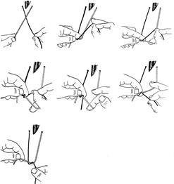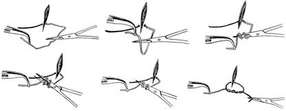Способы образования петель (узлов), применяемых в хирургии, подразделяются на ручные и инструментальные (аподактильные). Основным способом образования узлов является ручной (Рис.34, 35, 36, 37). Аподактильные способы используют для затягивания узла в глубине раны, в микрохирургии и в эндовидеохирургии (Рис.38).