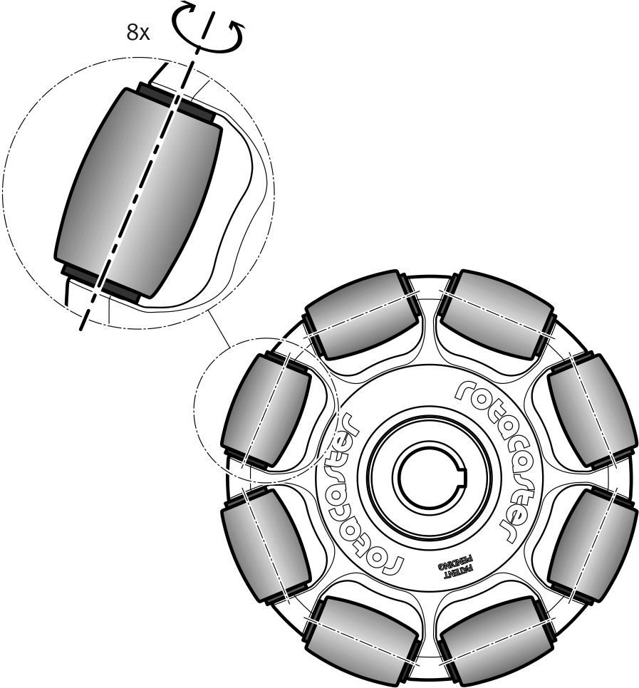 Если в действие приводится основное колесо, то два дополнительных колеса блокируются и действуют как поверхность качения для главного колеса. Если привод останавливается и транспортная система двигается в другом направлении, например, при помощи второго всенаправленного колеса, расположенного под прямым углом, то дополнительные колеса вращаются и тем самым сводят фрикционное сопротивление колеса к минимуму. Такой тип конструкции допускает быстрое перемещение практически под любым углом к направлению движения главного колеса.