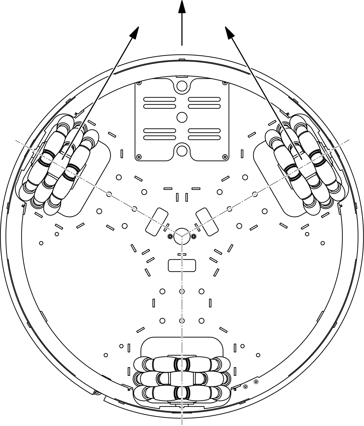 В случае использования симметричного привода колеса (разнонаправленные колеса или ролики) установлены под углом 120° друг к другу.