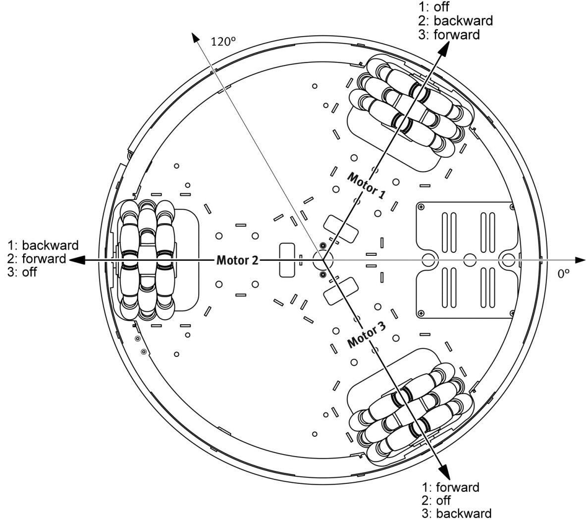Включение всенаправленного привода является достаточно сложной задачей. При использовании всенаправленного привода перемещение возможно только посредством трех управляемых колес. В случае применения всенаправленного привода включаются три приводных двигателя. Если предположить, что существует три управляющие команды для включения двигателя (вперед, назад, выключен), то только эти три возможности позволяют составить 27 вариантов для трех двигателей. Эти 27 вариантов управления позволяют управлять движением робота в различных направлениях.