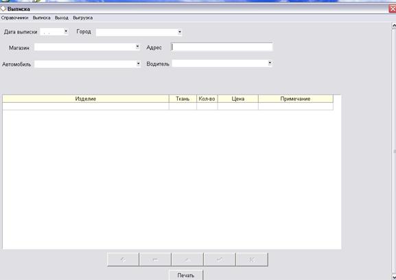 - нажимаем «+» и выбираем изделие, указываем категорию ткани (на фабрике используются 3 основных категории: 4, 5,6 и три категории кожи: 2, 4, 5), количество единиц и цену, которую берём из прайс-листа для данного магазина. Нажимаем подтверждение «v» и т.д.. Сделав выписку на один магазин, нажимаем печать, закрываем данную выписку и открываем новую, заполняя аналогичным образом на следующий магазин;