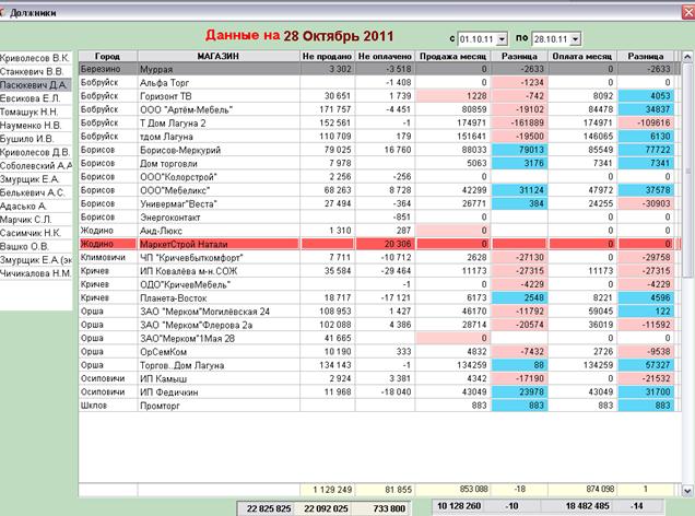 Положительные результаты в изменениях по продажам и оплате отражены синим цветом, отрицательные - розовым. «-» в графе оплата означает, что магазин перечислил предоплату за мебель. Если долг превышает допустимое значение, то строка с магазином загорается красным цветом и отгружать мебель сюда запрещено. Поставку можно будет возобновить только после оплаты или с разрешения руководства. Внизу общая разница по регионам, которые ведёт один менеджер (в нашем примере Пасюкевич Д. А.), отражается в процентном выражении.