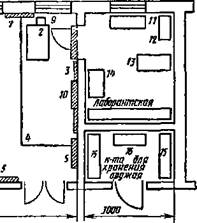 Киноаппарат и диапроектор в военном кабинете могут постоянно устанавливаться. при использовании их в классе гражданской обороны и в других случаях. Кроме того, в военном кабинете устанавливаются экран и приспособление (оборудование) для автоматического или полуавтоматического зашторивания окон. Киноаппарат и диапроектор могут устанавливаться в военном кабинете или лаборантской. Схема размещения технических средств в лаборантской показана на рис. 1.