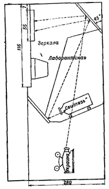 Рис. 1. Схема размещения проекционной аппаратуры в лаборантской (размеры даны в сантиметрах)