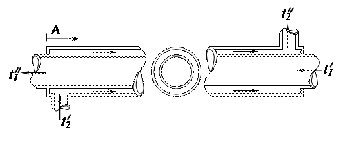 На рисунке показан кожухотрубный противоточный теплообменный аппарат типа «труба в трубе». В теплообменнике такого типа один