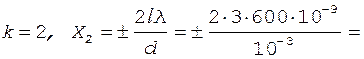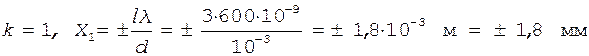 Решение. В опыте Юнга наблюдается явление интерференции света, которое выражается в его ослаблении или усилении. Так как по условию задачи выполняется одно из условий интерференции: l >> d, то можно воспользоваться формулой для нахождения координат максимумов интенсивности света
