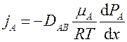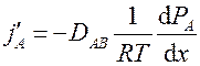 Запись закона Фика через парциальные давления. Если оба диффундирующие вещества представляют собой идеальные газы и находятся при постоянной температуре и постоянном давлении, то удобнее записывать закон Фика через температуру и парциальное давление вместо массовых или мольных концентраций. Запишем уравнение состояния идеального газа для смеси и выразим из него массовую и мольную концентрацию: