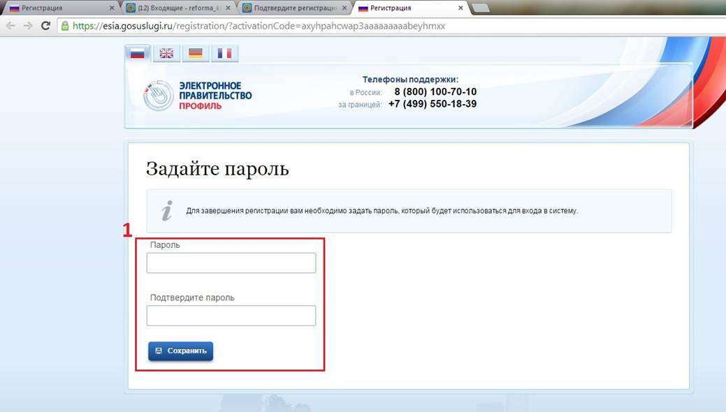 1. После перехода по ссылке откроется вкладка, где необходимо указать пароль для своей учетной записи. Вводим пароль и его подтверждение, далее жмем на кнопку «сохранить».